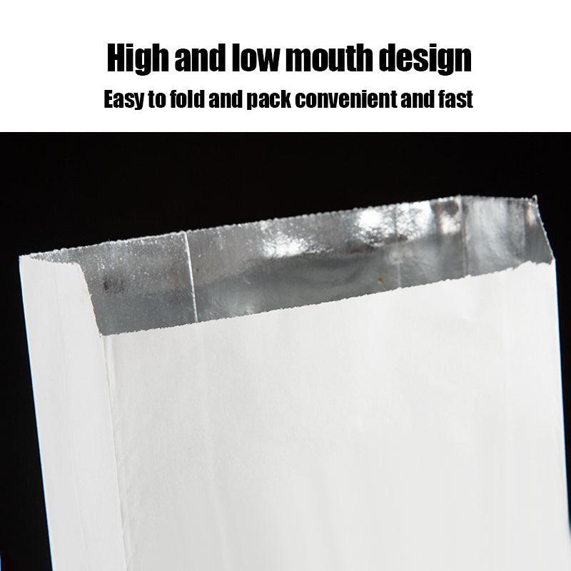 Foil-lined paper bags are made from premium kraft paper with a generous inner layer of aluminum foil. Their excellent greaseproof performance prevents the greasy food inside the bags from dirtying the consumers' hands.
