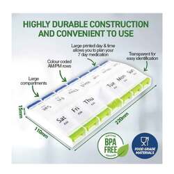 Made from high quality food grade plastic, the 1st Care Weekly AM/PM One-Touch Push-Button Pill Box offers large, deep compartments with large printed letters on each lid to assist the visually impaired.