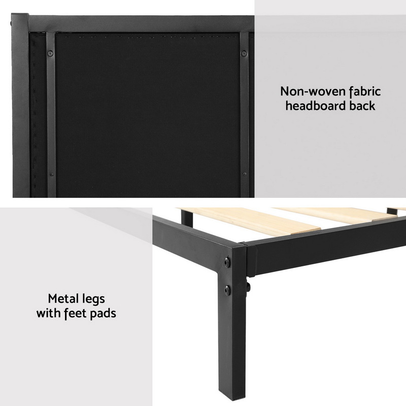Looking for an affordable bed frame that doesn't compromise on quality or style? Look no further than the PADA Bed Frame from Artiss. This industrial-style bed frame features an enhanced powder-coated and rust-resistant steel frame with strongly reinforced plywood centre slats to keep your mattress securely in place and well-ventilated. The strong centre support beams give the bed a solid weight capacity of 150kg. Topped with a luxurious charcoal fabric upholstered headboard, this frame creates a clean, classic look that will transform your bedroom into a peaceful oasis of relaxation. It features ample space underneath to fit trundle drawers or other storage solutions, perfect for keeping your bedroom tidy. The simple, industrial-style design ensures that it will complement any bedding or decor you choose to pair it with. Practical, functional and stylish, the PADA Bed Frame from Artiss is an easy purchase.