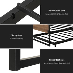 Looking for an affordable bed frame that doesn't compromise on quality or style? Look no further than the DEAN Bed Frame from Artiss. This industrial-style bed frame features an enhanced powder-coated and rust-resistant steel frame with strongly reinforced steel centre slats to keep your mattress securely in place. Topped with a dark wood MDF headboard and foot, this frame creates a clean, classic look that will transform your bedroom into a peaceful oasis of relaxation. The frame features plenty of room underneath for the included trundle bed, which can be placed to the left or right of the bed for a versatile layout. Perfectly fitted slots make the frame easy to assemble while rubber foot caps keep your floors protected from scratches. The simple, industrial-style design ensures that it will complement any bedding or decor you choose to pair it with. Suits Australian standard single-sized mattresses. Practical, functional and stylish, the DEAN Bed Frame from Artiss is an easy purchase.