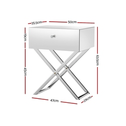Many bedside tables look mundane and ordinary, but not our glamorous Artiss Moco Bedside Table. Crafted from solid MDF board with mirrored glass panels, our bedside table is incredibly durable and built to last. The stainless-steel cross-legged design is not only uniquely stylish but provides additional support. The generous-sized storage drawer is fronted by a gorgeous crystal drawer knob and opens smoothly to ample space for your bedside essentials. The generous tabletop has a weight capacity of 20kg for your favourite books, décor or other trinkets. Of course, our bedside table need not be confined to your bedside. It also sits well next to your favourite armchair or at any end of your lounge set. Easy to assemble and even easier to maintain, the Artiss Moco Bedside Table is the perfect addition to any bedroom.