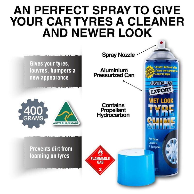 AUSTRALIAN EXPORT Wet Look Tyre Shine is perfect to give your vehicles tyre a fresh, crisp, clean look. Available in our 12 piece value pack????this product will give your bumpers, tyres and side mouldings a new appearance as well as preventing dirt from forming on your tyres.????Proudly Australian Made, this product can be applied to multiple surfaces. Suitable for cars, trucks and motorcycles.