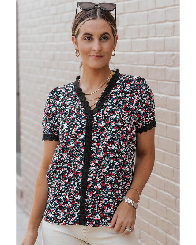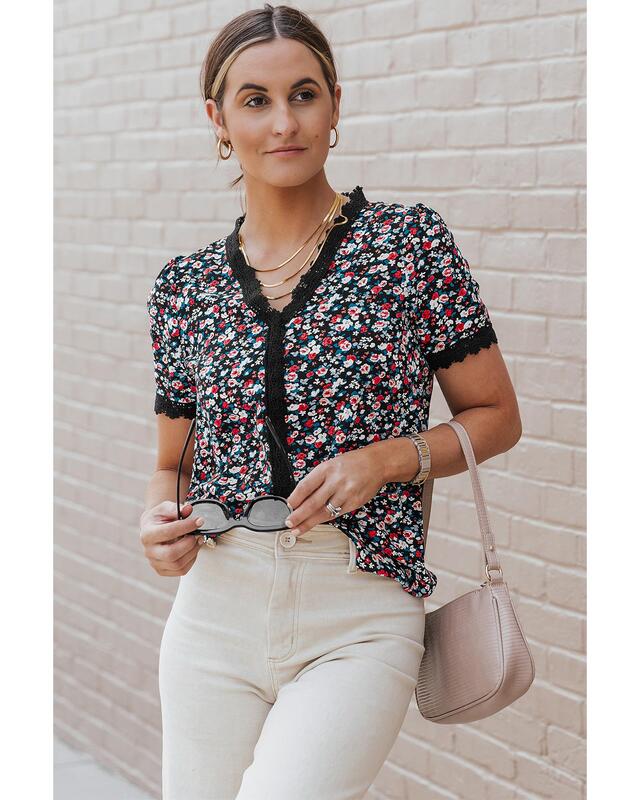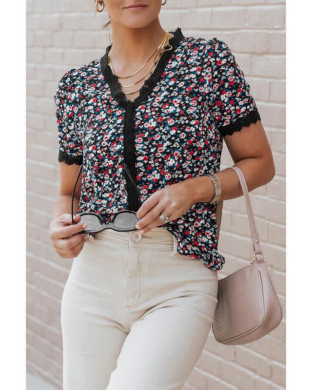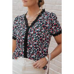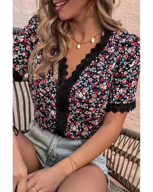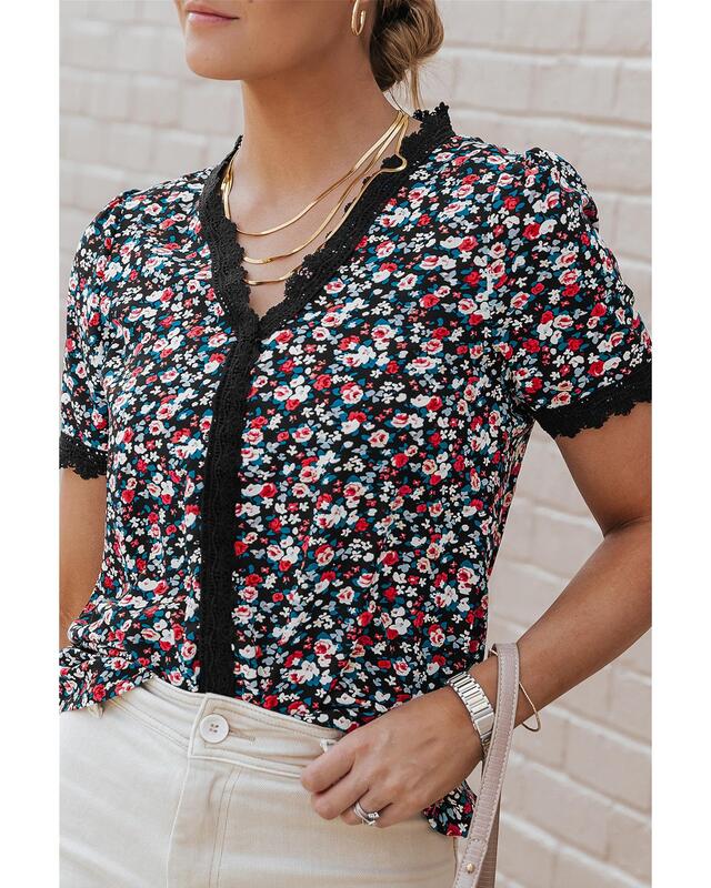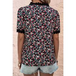 - Multicolor Ditsy Floral Lace Trim Casual Blouse