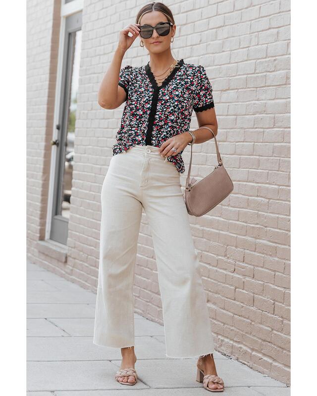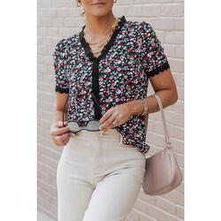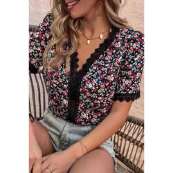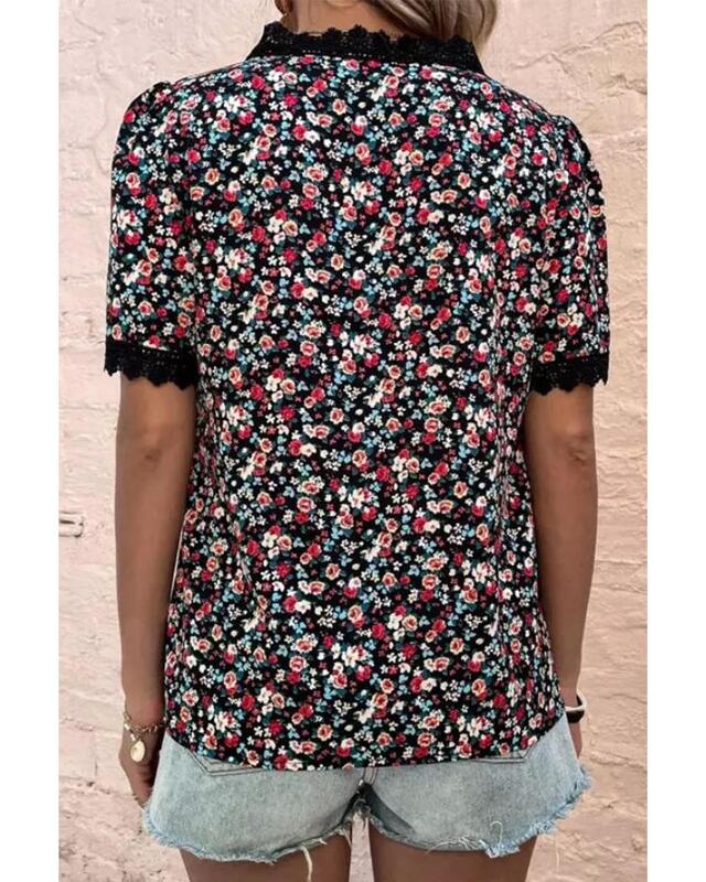 - Multicolor Ditsy Floral Lace Trim Casual Blouse