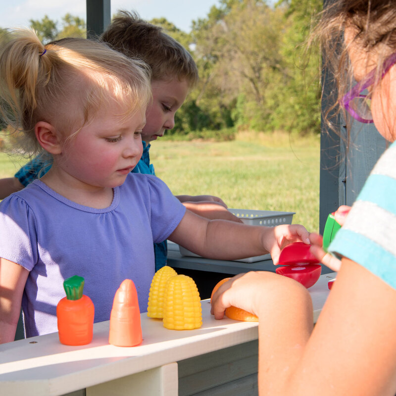 The spacious Spring Cottage playhouse by Backyard Discovery will set your backyard apart from all others. The beautiful colors and contemporary curved roof design will surely turn a head or two. Your children will enjoy the outdoors by skipping through the garden gate on their way around the back to sit at the snack window and prepare feasts in the fully-stocked kitchen for all your neighbors.