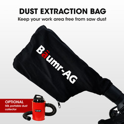 The Baumr-AG DBR-305 cast aluminium base, extendable work table supports and securing clamp make it simple and safe to keep your workpiece secure and in place. The DBR-305 drop saw comes complete with a sawdust collection bag, and gives you the option of attaching the Baumr-AG BM-DD5 vacuum for maximum sawdust extraction and collection.