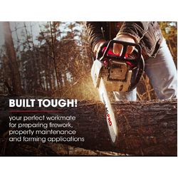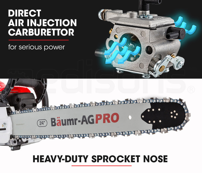 The massive 24 inch bar sports a 12 toothed sprocket nose for an excellent transfer of cutting power, from chain to wood. The premium full chisel chain utilises Baumr-AG's Tru-Sharp technology. These chains produce very little kick-back and accurate cuts as a result. An adjustable auto-chain lubricatorkeeps the chain well oiled and has a large dial for adjustments on the fly.