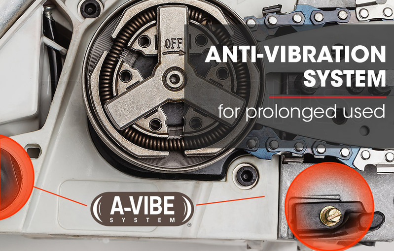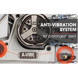 The balanced body feels great to hold and cut with as the bumper spike forms a perfect pivot point at the centre of the chainsaw. The large, grippy handles fit comfortably in both hands for left and right-handed users. The handles are mounted with heavy-duty springs, using the A-Vibe anti-vibration system. This system dramatically reduces vibrations passed from machine to user.