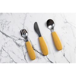 Ideally suited for kids aged around 2-6. The handles are slightly thinner and longer than our Toddler Silvies to suit slightly bigger hands. The fork still features rounded tips for safety and resembles more of a spork to assist with learning to spike foods. The addition of the safety knife allows your little one to feel just like mum and dad and start practicing their knife skills by slicing some softer foods.