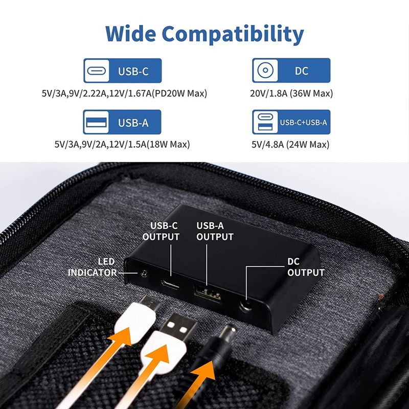 - Compatible with Most Devices: One USB port with 5V/3A, 9V/2A, 12V/1.5A to charge fast your cellphones and other 5V usb-powered devices; DC output (20V/1.8A) is compatible with some small power stations(less than 200W), and a USB-C Output (5V/3A, 9V/2.22A, 12V/1.67A) can provide PD 20W power for your iPad or Switch; this upgraded solar panel can meet your power demands in emergency or camping trip.