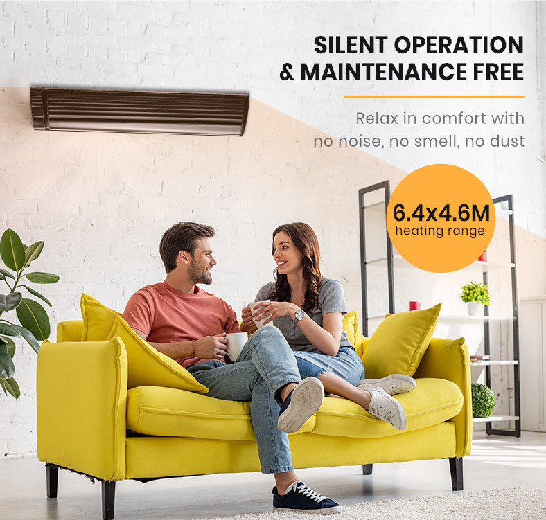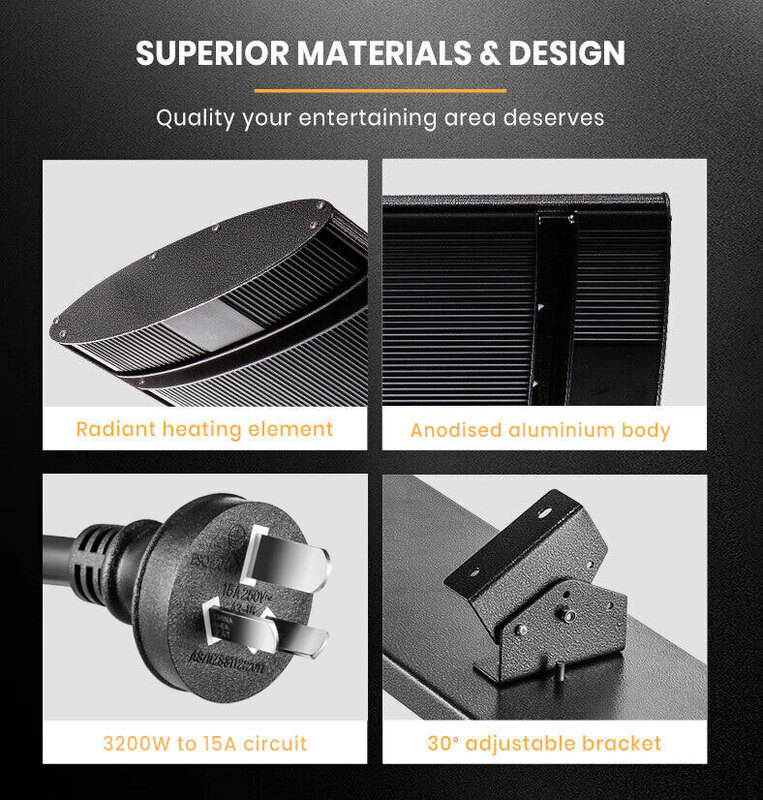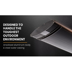 A 3200 watt electric element is embedded in the black anodised aluminium strip that rapidly produces even and gentle heat dispersion. Plus, unlike gas heaters there is no glow or glare, and no need to refuel - providing huge running costs savings.