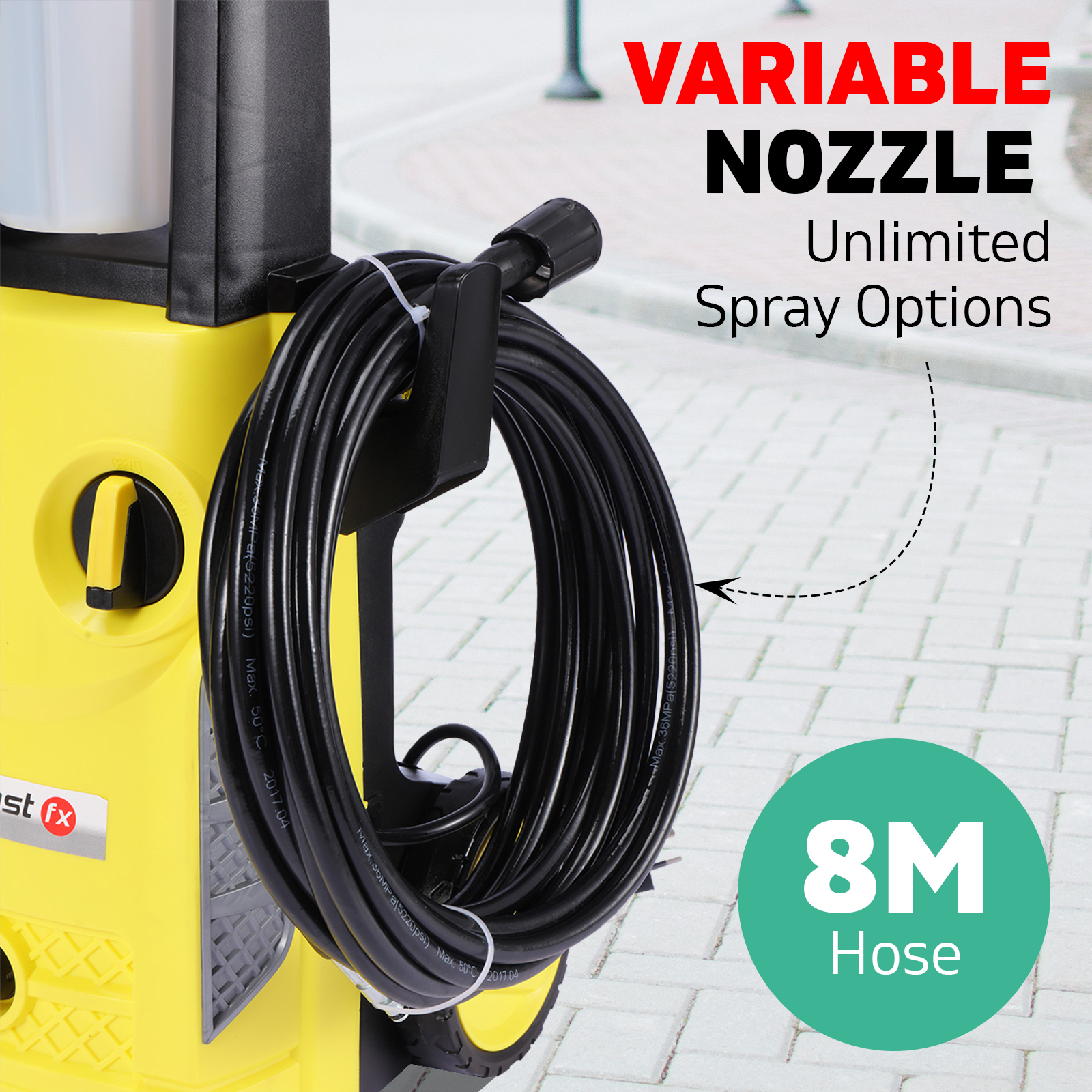 - The Blast FX uses a commercial grade 8m hose which allows you extended reach whether it be for washing your vehicle or working in the back yard.