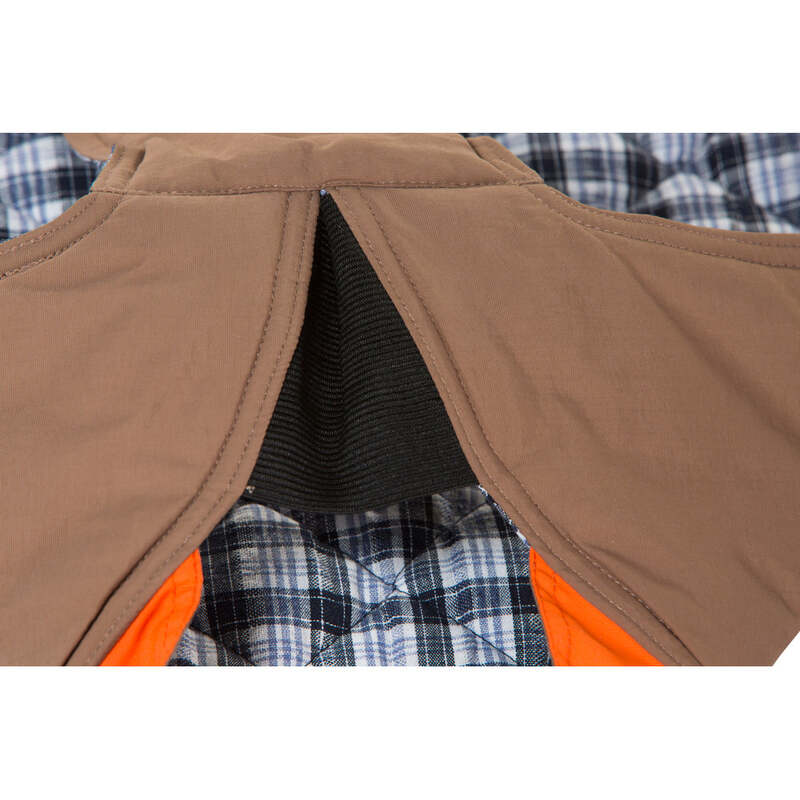 The earth brown all-weather dog coat with orange highlights is an outdoor gear essential. The unique design of our dog coat allows it to wrap around the chest area to cover and provide extra protection from rain and mud. Easy to fit with velcro straps on top.