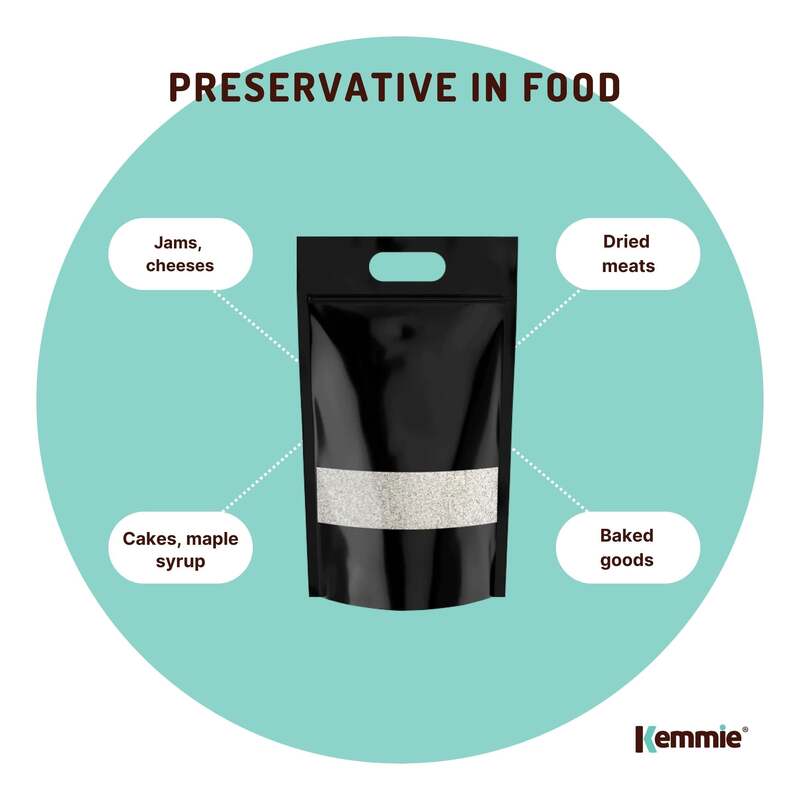 - Preservative in food (E202) - jams, cheeses, dried meats, cakes, maple syrup, baked goods