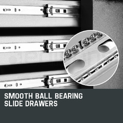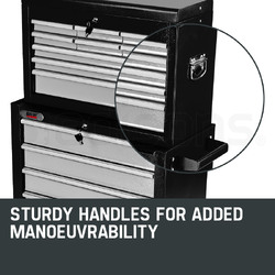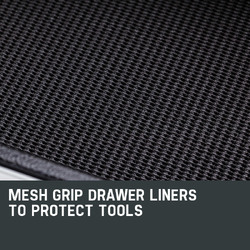 Both the cabinet and chest are built with high tensile powder coated steel enclosures. The top of the cabinet features an impact absorbent gripped surface to keep the chest secured firmly in place when mounted on top. Each drawer slides effortlessly in and out on smooth ball bearing rails, which makes finding and accessing each tool a cinch, and each drawer contains mesh grip liners to ensure your tools stay put when transporting. Both the cabinet and chest are easily transportable thanks to their side handles.