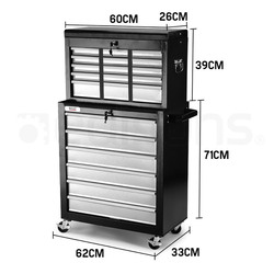 This combination split tool cabinet offers an instant equipment and parts storage solution to make your workspace more efficient and easier to comprehend. It?? the essential addition to any garage or workshop. Order your very own Bullet 15 Drawer Tool Box Cabinet today!
