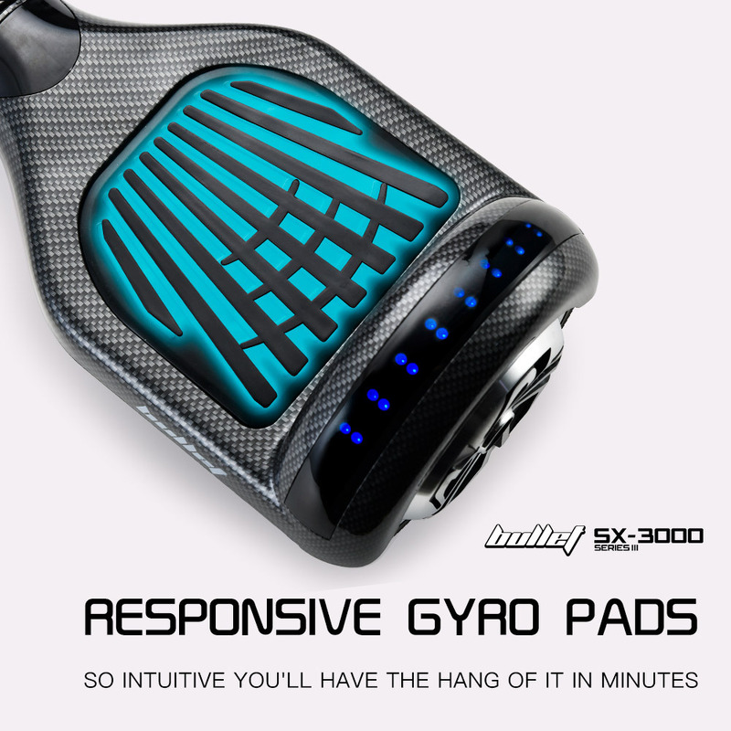 The NEW Bullet SX-3000 Series III Electric Hoverboard Scooter brings a whole new concept of travel to the streets. This state-of-the-art self-balancing device reacts instinctively to your body's shifting movements for highly responsive acceleration, turning and reversing.