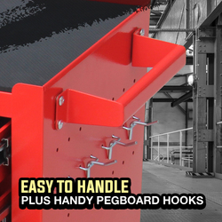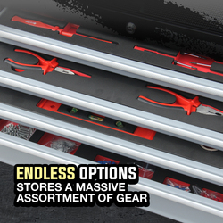 The tools are secured within fitted inserts and separate tool cases contained in the double drawers and large lower cabinet. Each drawer slides effortlessly in and out on smooth ball bearing rails, which makes finding and accessing each tool a cinch. The lower cabinet features a self-contained door that stays open and out of the way for easy access to its contents. This space is large enough to keep a range of bulkier items. The unit sits on top of four castor wheels with 2x castor locks, so you have the option to secure it in one place or move it with you around a workspace. This all-inclusive compact unit contains an incredible 622 pieces and discreetly fits in even the smallest workspaces or storage areas. The cabinet also has a pegboard side panel with five included hangers.