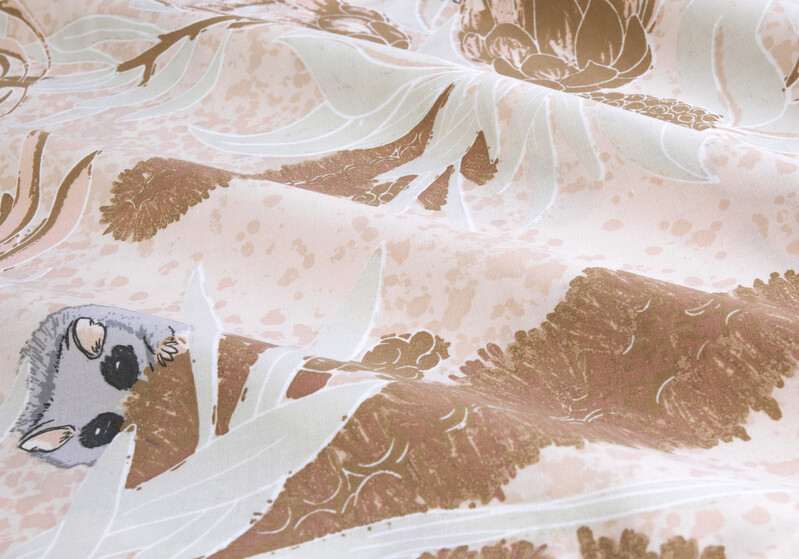 The Bush Baby Quilt Cover Set features sweet Aussie flora and fauna over a muted, rosy pink background.