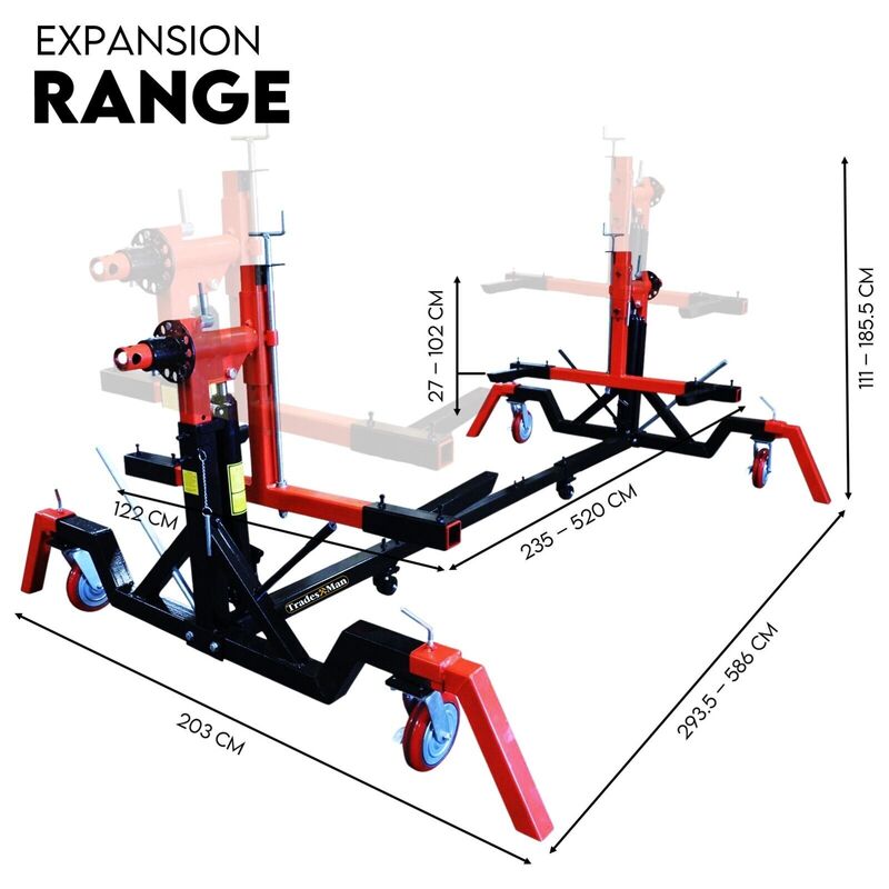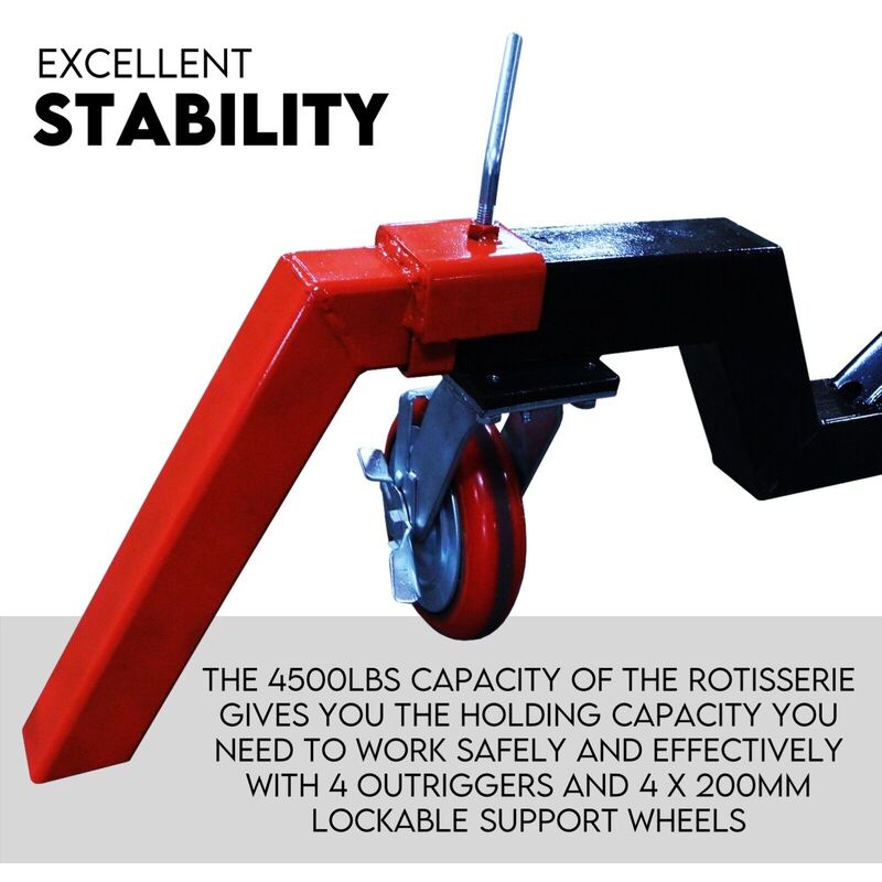 Tradesman Auto Rotisserie 4500LBS is perfect for body shops, gear drives, race car fabrication, and classic car restoration. It includes outriggers (4 stabilizer legs) and 4 locking casters to keep the rotisserie in place.