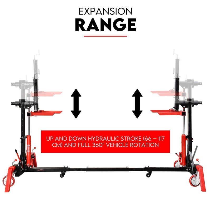 Its heavy duty steel construction and adjustable width makes your work easier and smoother. This rotisserie can fully rotate 360 degrees and saves you time and effort when performing any operation. Easier on your body and less fatigue while working on the vehicle.