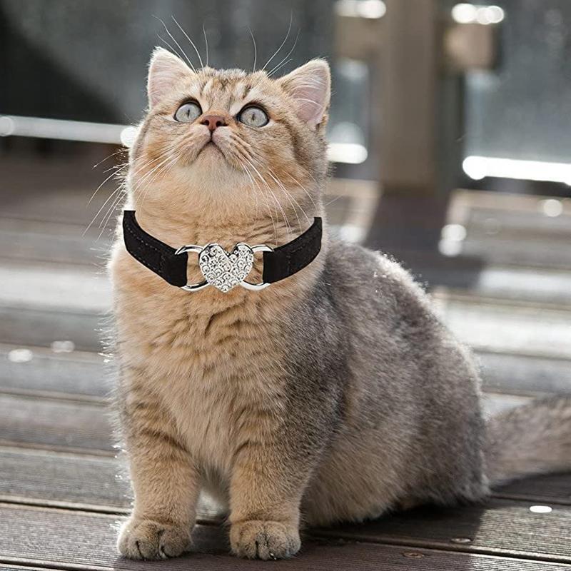 Cat Collar Suede Kitten Pet safety elastic Adjustable Bell Heart Bling Pink blue