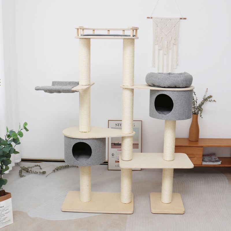 Looking for a cat tree that is a fun, interactive way to keep your cat or kitten entertained? Look no further than the 5-Tier Cat Tower by Catio! This cat tree with unique features a sturdy wood base, 2 perches for napping, a barrel-shaped cat condo, two sisal rope scratching posts, and a nice comfortable hammock. Designed as attractive cat furniture that complements any home.