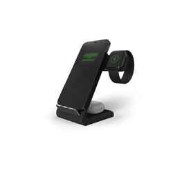 * Charges 3 devices at once: phone, AirPods/AirPods Pro and Apple Watch (all series)* Qi certified to work with Qi enabled devices* Plugs into power with a USB-C to USB-C cable (1m cable and 20W/2.22A wall plug included)* Swing arm allows Apple Watch face to be visible in nightstand mode while charging* Compatible with AirPods in wireless charging case* Compatible with most phone cases (non-metal) up to 5mm thick