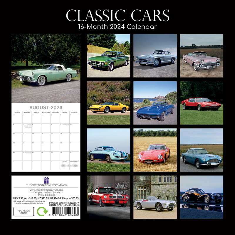 Classic Cars 2024 Square Wall Calendar 16 Months Planner Christmas New Year Gift