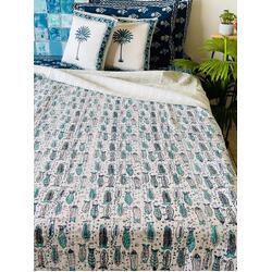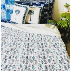 This Fish Kantha is hand stitched and hand printed by the local artisans of India on 100% cotton. It can accentuate your room space and refresh it. The Fish print is quite a fun print, which will give a tropical touch to the room as well. This is a lightweight bedspread which has two cotton fabrics all hand stitched together. The Blue fish kantha can be used as a bedspread, a coverlet, a quilt or a throw for the bed.