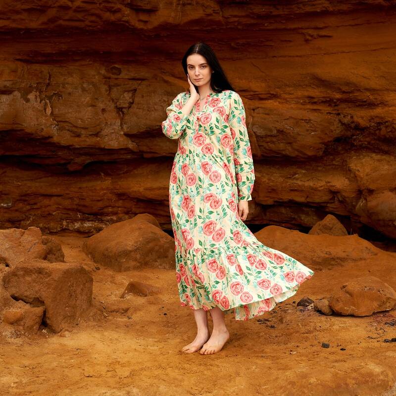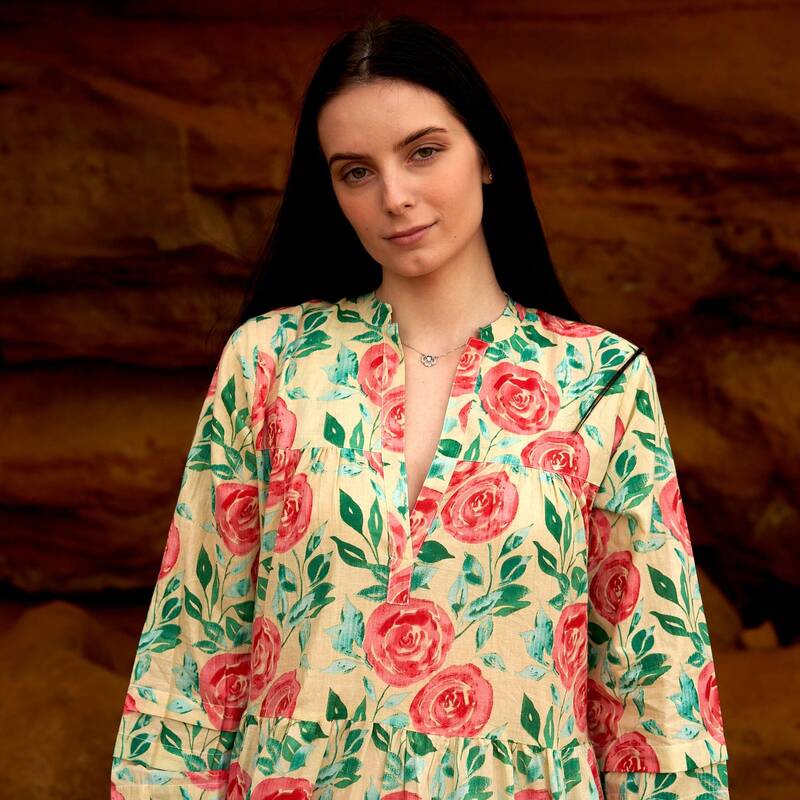 • This dress is made 100% cotton. The fabric is screen printed by hand.