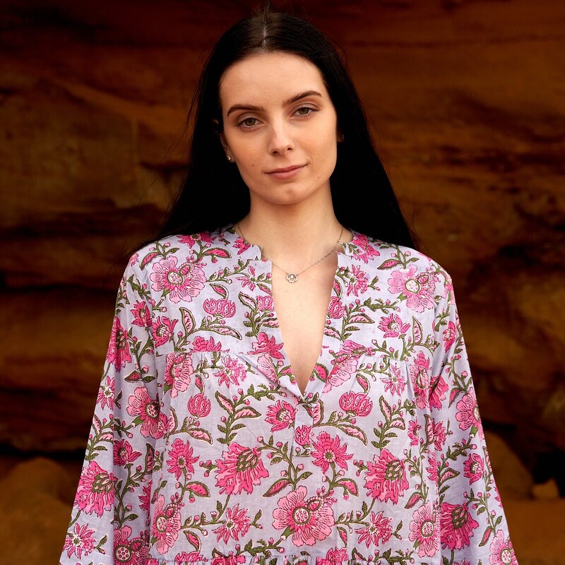 • This dress is made 100% cotton. The fabric is screen printed by hand.