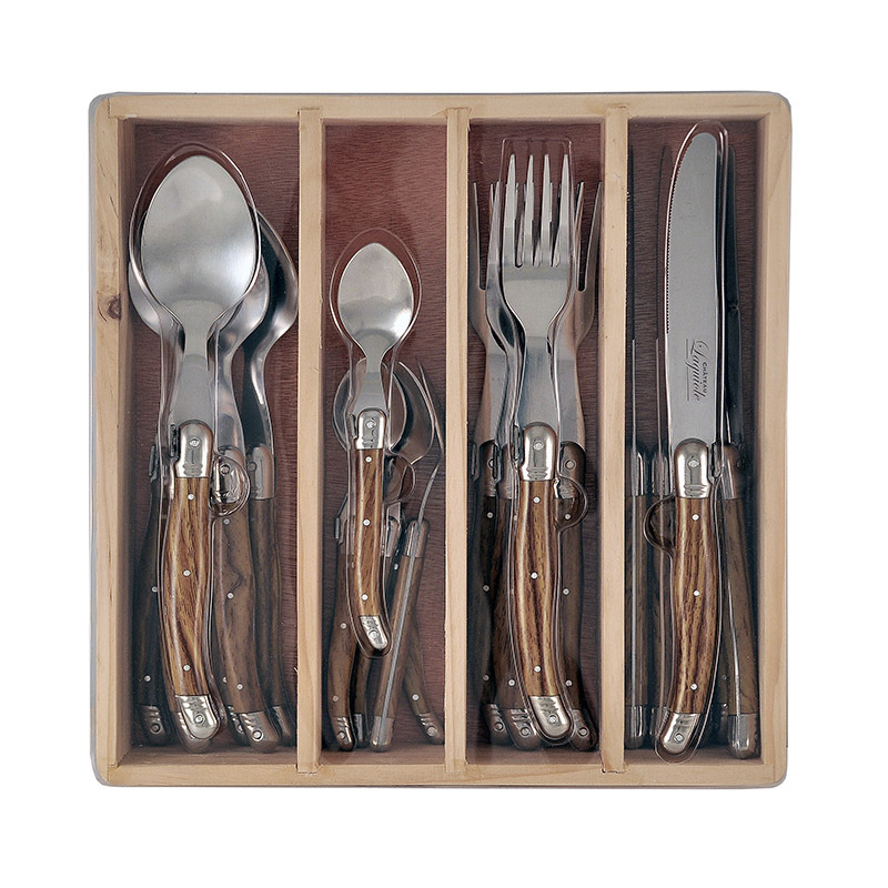 Chateau Laguiole 24 piece Wooden Cutlery Set is great for casual, formal, fun, indoor and outdoor use. Consists of 6 x Table Knives, 6 x Table Forks, 6 x Tablespoons, 6 x Teaspoon. Dishwasher Safe. Laguiole is not a Trade Mark it identifies the design.