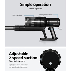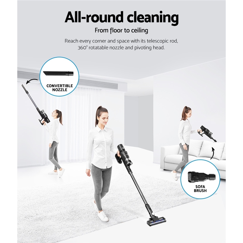 With its powerful suction and convenient design, Devanti handstick vacuum cleaner lets you keep your hard floor clean easily and achieve a tidy-looking space. It features a soft roller that is gentle on hard floors but tough on dirt and dust, and the upgraded brushless motor makes for powerful suction with adjustable two-speed modes. It also produces low noise and is energy efficient. Additionally, the vacuum cleaner is powered by a 2000mAh rechargeable Li-ion battery, which ensures a long run time. It also has a swivel vacuum head, tilt and angle adjustment, and flexible stick movement for maneuverability, good control, and easy cleaning in tight spaces, and the portable and lightweight design makes it easy to carry around. For added convenience, this Devanti vacuum cleaner is cordless and bagless. It comes in one package and includes a sofa brush, charger adaptor, washable and reusable HEPA filter, rechargeable battery, wall-mounting holder, long crevice brush, wall-mounting accessories, and a user manual for easy assembly. Shop our Devanti handstick vacuum cleaner for effortless cleaning.