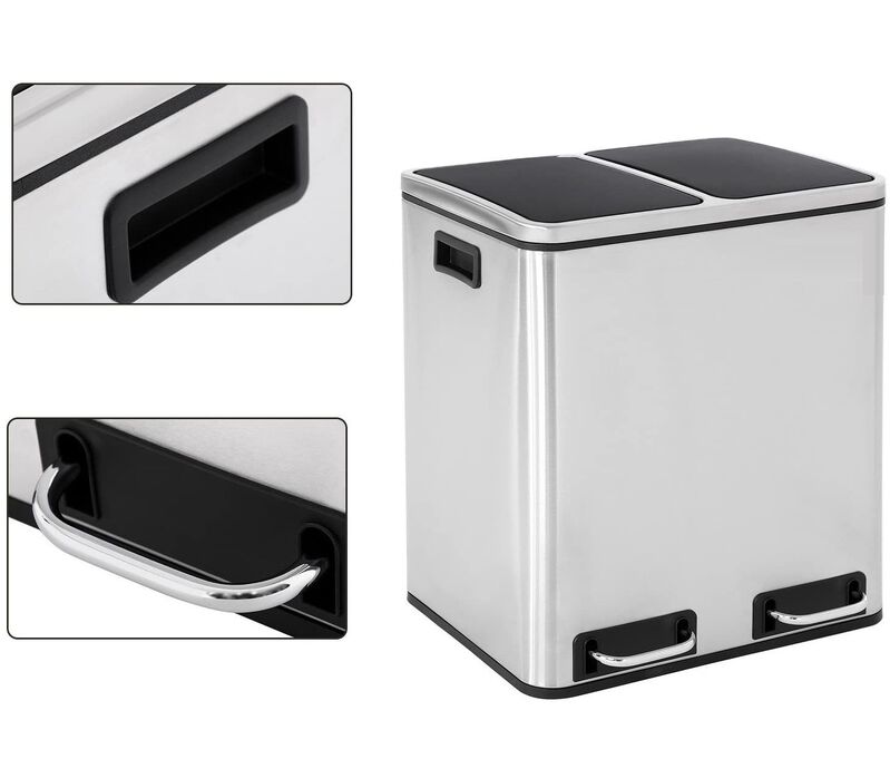 - This dual trash can is designed for convenience and quietness. Step on the pedal to open the lid without having to touch it, and the lid will close silently and softly after you release the pedal ? no more loud slamming.