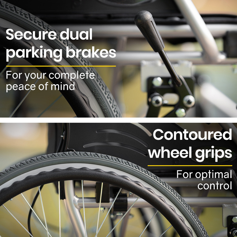 This premium lightweight wheelchair features fold up footrests allowing for access onto the wheelchair. The comfy padded seat and generously proportioned backrest ensure a comfortable ride. And, thanks to the 2 second folding action and ergonomic handles, it makes for a relaxing day out for any helpers, too! They can activate the easy access dual brakes to safely go down hills and ramps, while dual parking brakes can lock the wheels into position - a perfect time to pull out some reading material from the backrest pouch!