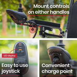 Twin motors offering a total of 500 watts offer an enjoyable riding experience with smooth and responsive performance, not to mention the ability to climb hills and ramps right up to a 15-degree incline! A tight 1m turning circle offers the manoeuvrability you need on paths and in places like shopping centres and airports.