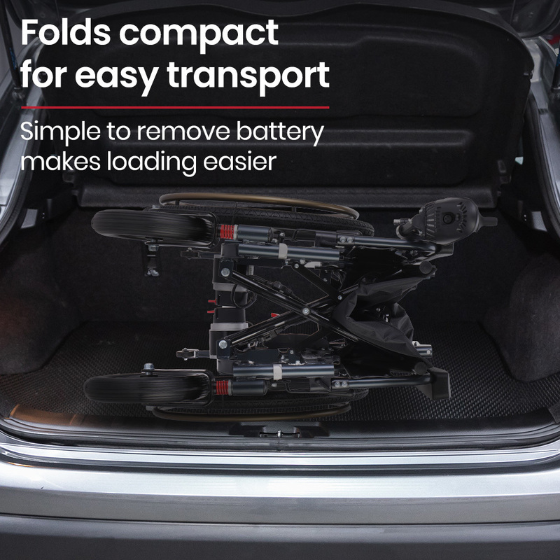The Equipmed motorised wheelchair is quick to fold. Plus, a sturdy steel frame and easy-to-remove lithium battery mean that it is as light as possible for loading into a car boot or moving into a space-saving storage position.
