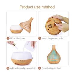 With an elegant wood grain narrow top vase design, this 400ml ultrasonic electric air mist ultrasonic humidifier is used for aromatherapy by diffusing essential oils and mist into the air. Remote controlled, the diffuser is useful as a night light featuring 7 controllable colour changing LED lights.