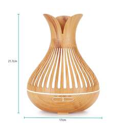 With an elegant wood grain flower top vase design, this 500ml ultrasonic electric air mist ultrasonic humidifier is used for aromatherapy by diffusing essential oils and mist into the air. Remote controlled, the diffuser is useful as a night light featuring 7 controllable colour changing LED lights.