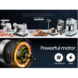 The wire whisk, spiral dough hook and flat beater can each be conveniently attached and removed easily in seconds. These stainless steel attachments along with the bowl exceed food industry standards worldwide. A full metal body design offers both stability and effortless cleaning, while the protective guard provides peace of mind. The EuroChef Commercial range is offered direct to the public at wholesale prices, making this stand mixer a smart investment for savvy owners of bakeries, restaurants, pizzerias and school canteens.