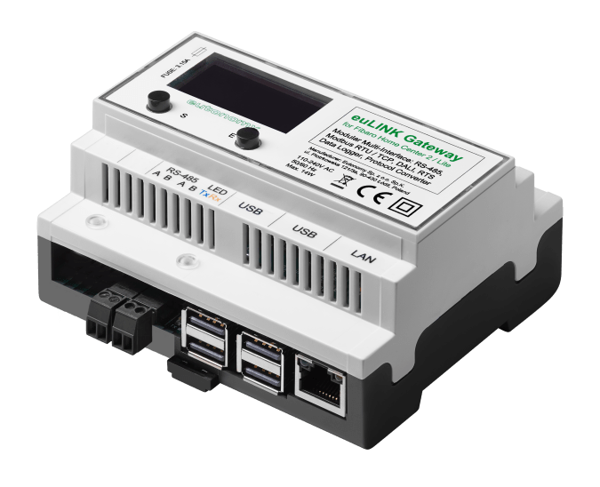 The euLINK gateway has modular design and can be upgraded with various peripheral modules e.g. DALI ports connected to the SPI ports or to I2C ports of the central unit. There is also an euLINK Lite version with half the RAM memory 1 GB and a slightly slower processor.