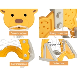 Foster your children's love of sport early with the children's Basketball Hoop Set from Keezi. Made from non-toxic PP material with a smooth surface and stable triangular base, the hoop is safe for children 3-7 years old. The 5-in-1 activity centre is not just for basketball. With a soccer game, ring toss game, golf game and removable music box, your children will be entertained for hours on end. The stand is height adjustable to account for different ages and heights. Add water to the base structure for increased stability. The stand can be used indoors or outdoors, so you can enjoy exercise anywhere, anytime. Easy to assemble and maintain, your kids will love the exciting thrills of the 5-in-1 Basketball Hoop Set from Keezi.