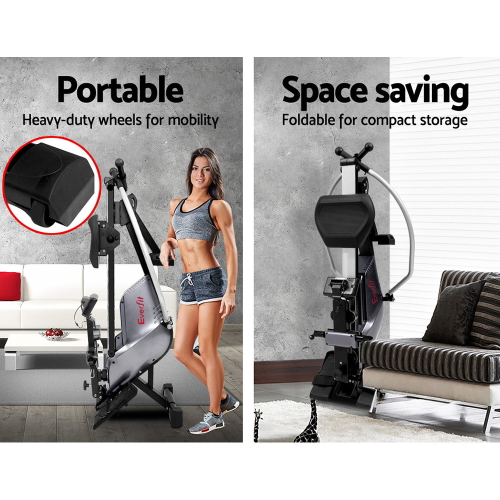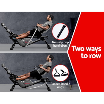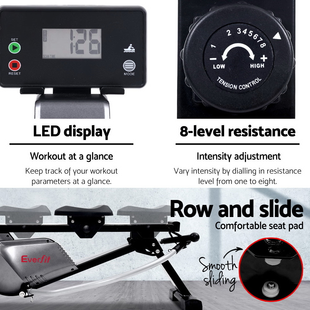 Simple but satisfying. Our Everfit Vulcan Rowing Machine, utilising a magnetic brake system, targets all the major muscle groups for well-toned abs, back and legs. Simply select the workouts you desire, with up to eight levels of manual resistance, and monitor the progress on the large LED display console. You also have the option of rowing in two different ways, using the 360? rotatable arms with non-slip handlebars or padded handle rings. This fitness machine is just perfect for home fitness routines with its quiet operation and super sturdy frame. Featuring anti-slip footrests with adjustable foot straps to ensure secure smooth glides, the rowing machine also has a moulded seat for comfort while burning up the calories. There is also a built-in bottle holder so that you always have a refreshing drink handy to keep you hydrated during heavy workouts. With a weight capacity of up to 150kg, the rowing machine is no push over in terms of strength and durability. And when the huffing and puffing is done, simply fold it and store till the next session.