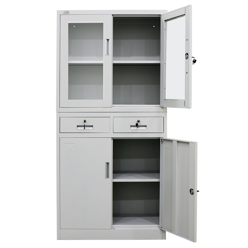 FORTIA 4-Door Lockable Steel Stationery Storage Cabinet, Display Windows, 2 Drawers, Grey