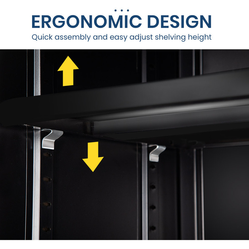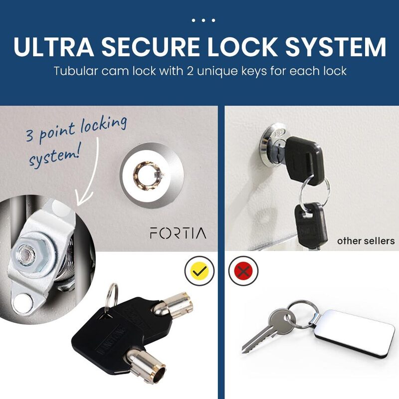 Unlike others on the market, the FORTIA system features a superior tubular cam-lock system. Every lock comes with 2 compatible keys, and the internal shelving is easily adjustable to suit your needs.