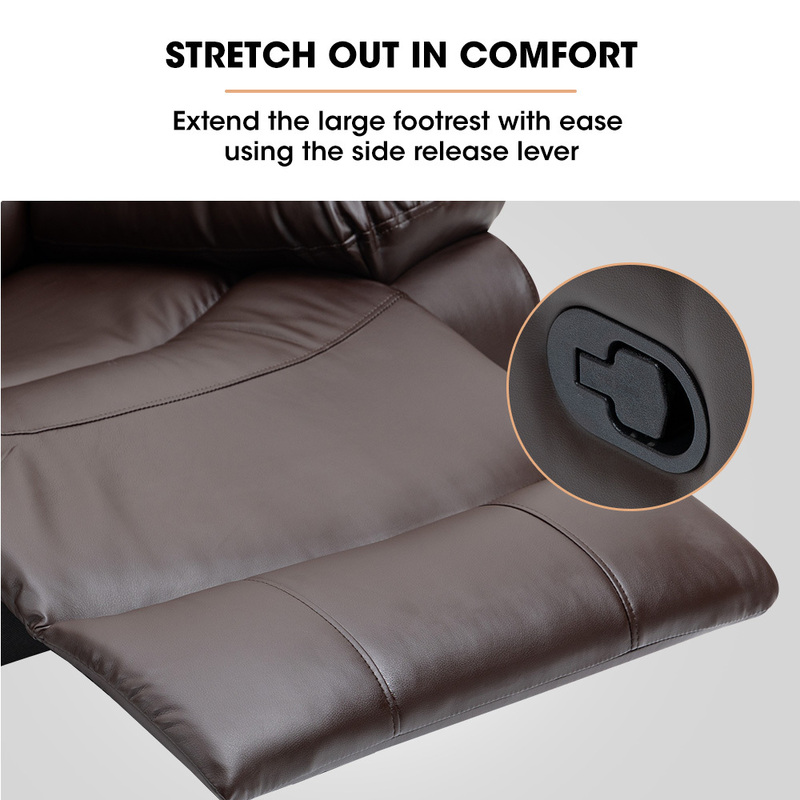This Recliner Chair from Fortia offers an ultra-comfortable experience with plush premium cushioning and luxurious faux leather from top to bottom. With a pull of the side lever you can put your feet up at up to a 145? angle, thanks to the reclining backrest and extending footrest. It?? easy to select the ideal position for watching television, reading or having a nap.