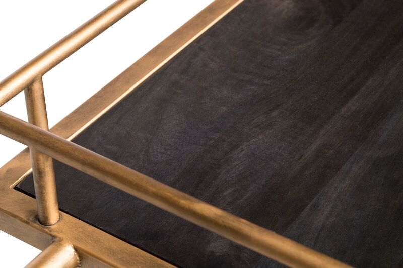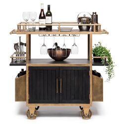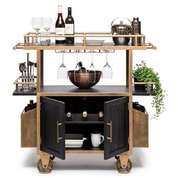 The French Brass and Black Drinks Trolley Bar Cart with Bottle Rack Storage is a true Bar powerhouse featuring a stunning one-of-a-kind design. This Minimalist Bar Cart exquisitely combines a visually appealing richly grained Wood finished in Black with a vibrant French Brass finish on the sturdy Iron frame. With the spacious Multi-Levelled Structure, Dual Wood Shelf Bases and Built-in Stemware and Bottle Racks, you will never run out of space for your favourite Bar and Cocktail essentials. Not only that, with such a flexible design, this item can also be used as a Kitchen Island to store your appliances and dishes – the choice is yours and the options are endless!
