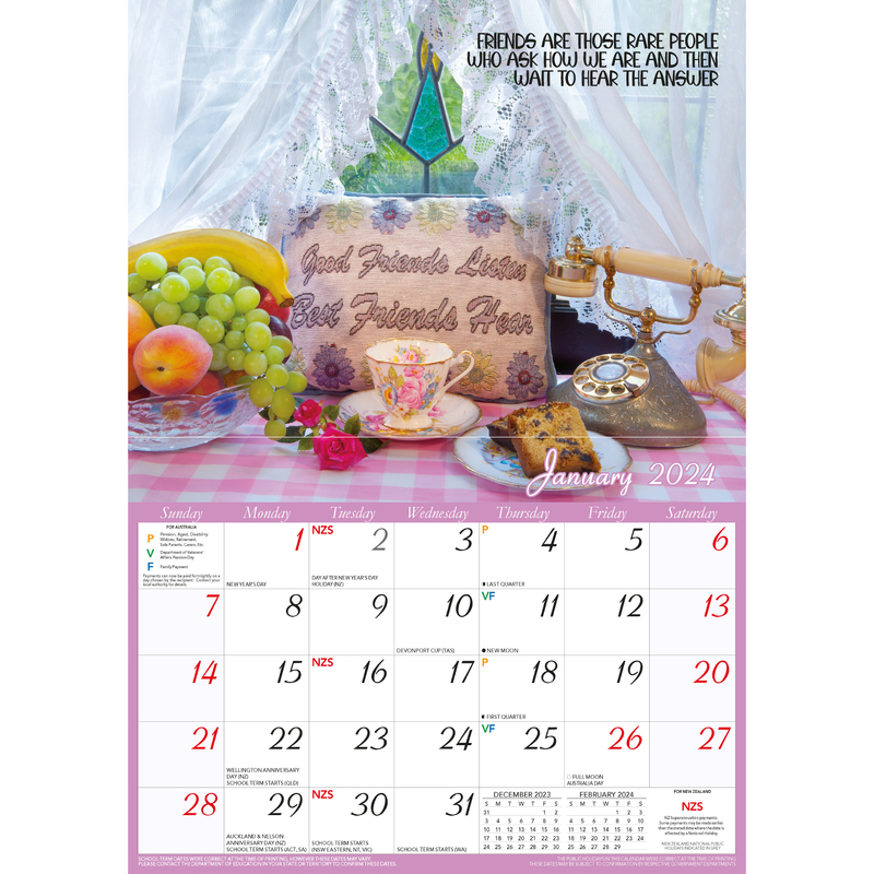 - Public Holidays, pension dates, and school terms for Australia and New Zealand are marked on the calendar.