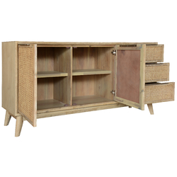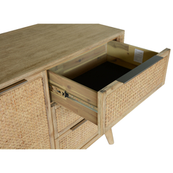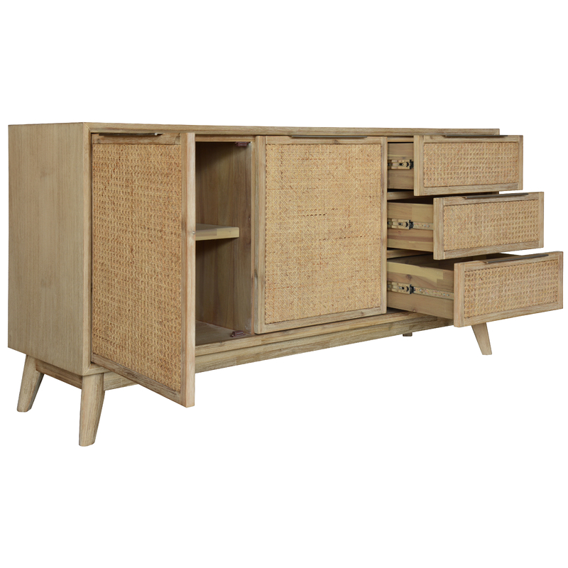 Add ease and cleanliness to your living room by placing a buffet here. This buffet, beautifully designed in the Tropical style, will make your life a little easier. It not only increases storage space in your living room but also beautifies it. It has 2 doors, covering 4 compartments- 2 shelves on each side- and 3 drawers with full extension metal runners. The buffet has attractive tapered legs. The doors and drawers have silver metal handles. It is a furniture piece in a brushed smoke colour. Adding to its strength and charm, the buffet is made of sustainably harvested Solid Acacia timber paired with a rattan accent, withrich grain and beautiful knots that give it a unique look. A felt fabric liner on the top drawers carefully protects your delicate items, such as jewellery. The buffet's doors and drawers have beautiful Rattan work, giving them an ethnic look. The fully assembled buffet comes with a one-year warranty.